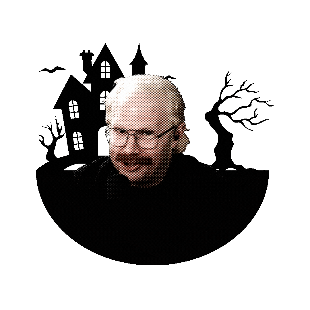 A man named Henry Zebrowski with glasses and a mustache, surrounded by Halloween-themed illustrations of haunted houses and leafless trees.